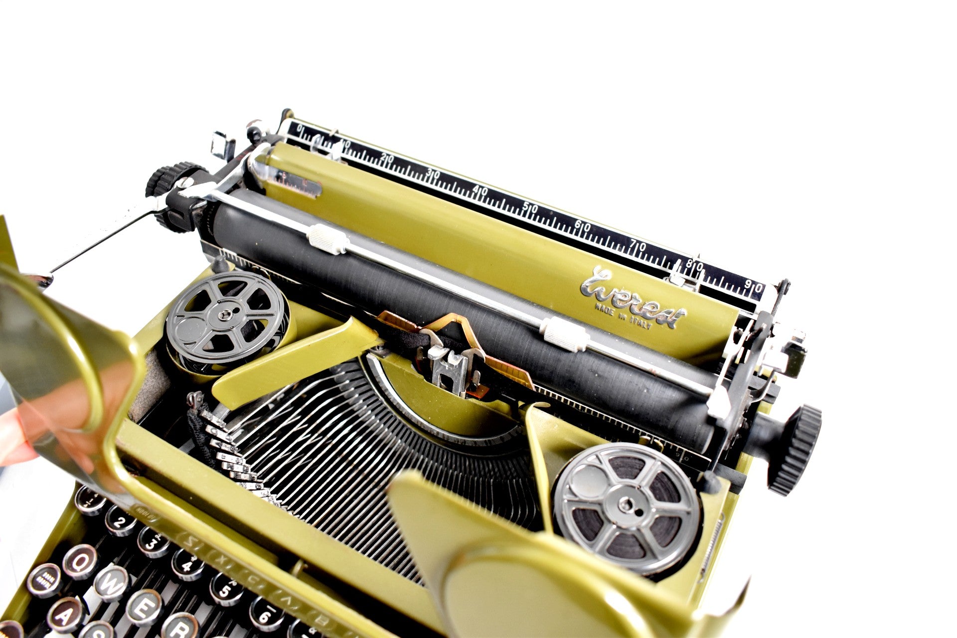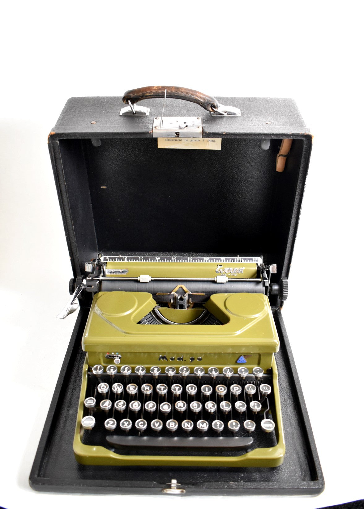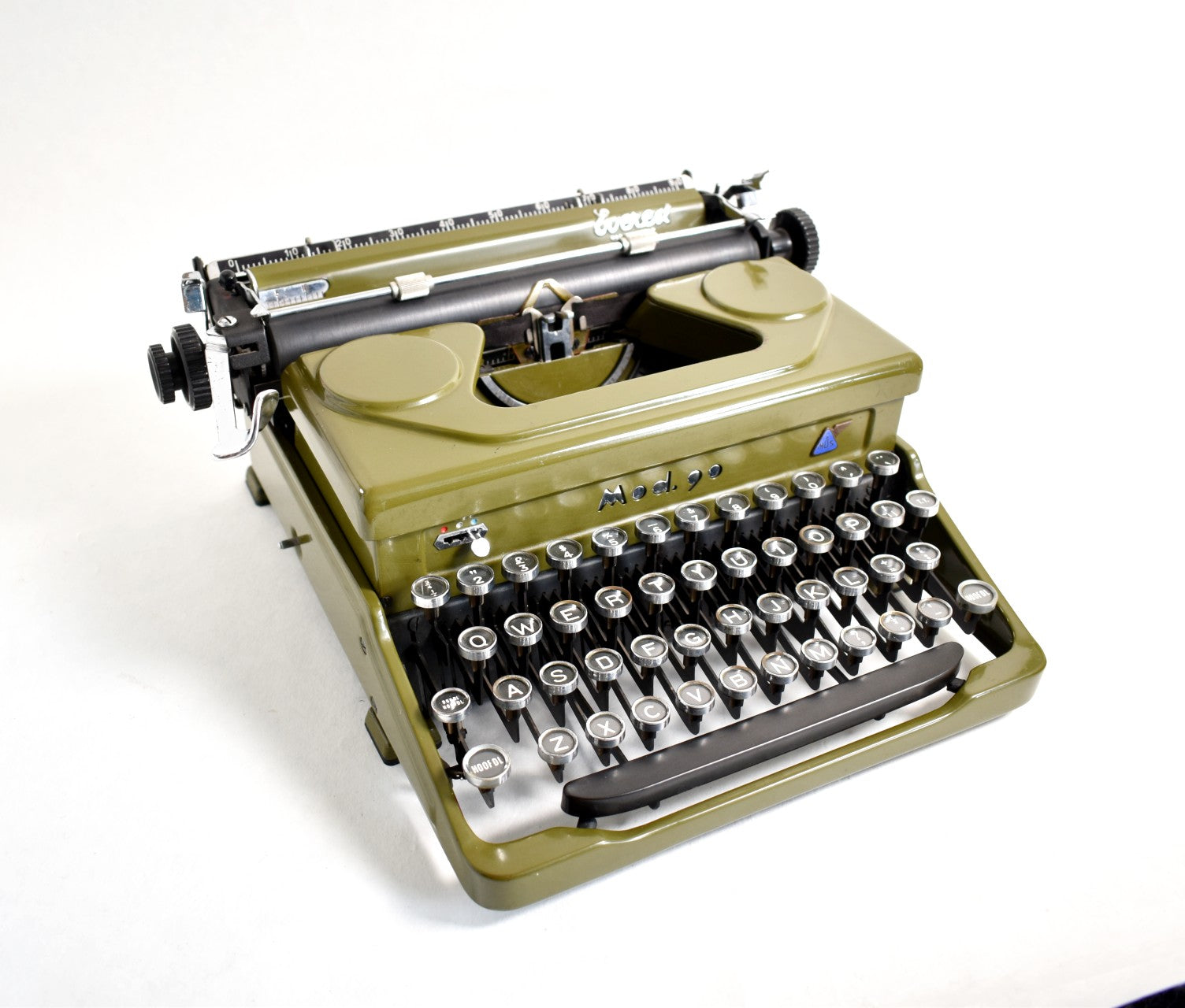 Verbluffend mooie Everest Mod. 90 typemachine. Everest typemachines werden in Italië gemaakt en later overgenomen door het beroemde bedrijf Olivetti. Prachtig Everest-logo in de rechterbovenhoek - een klein embleem. Deze heeft een ongewone bosgroene kleur. Hij werd in 1952 in Italië gemaakt naar een Italiaanse ontwerper. Hij heeft zeer gevoelige glazen toetsen en aanpasbare functies - zoals marge-instelling, kleurwissel (voor verschillende inktkleuren), marge-ontgrendeling, enz.
