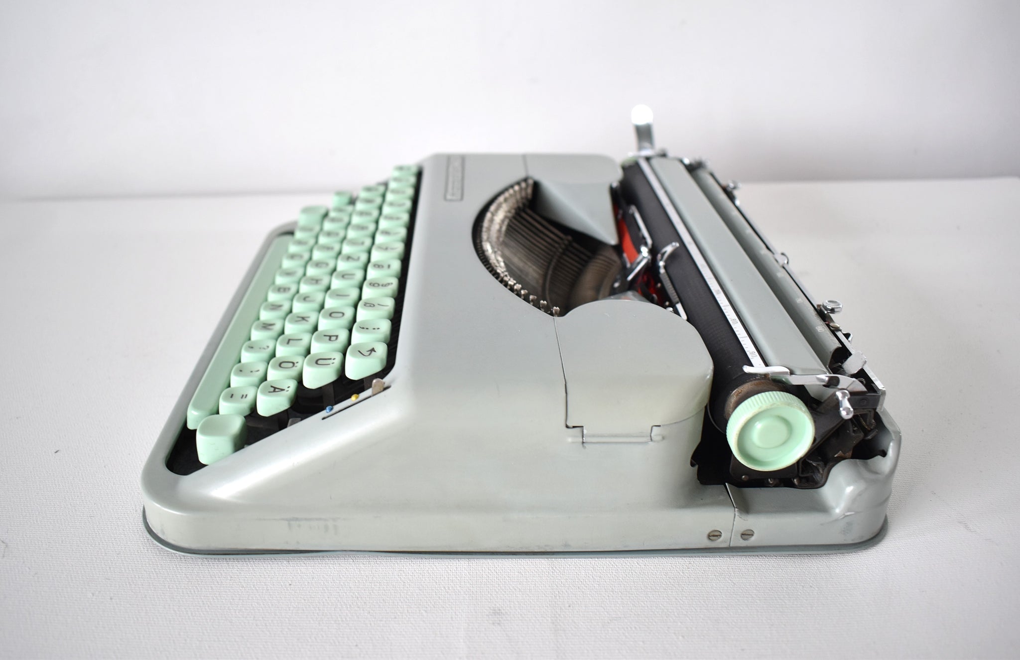 *COSMETICA: Deze typemachine verkeert in uitstekende staat. Gladde, metaalgroene lak. De verchroomde metalen onderdelen zien er fantastisch uit. De machine is afgewerkt met een beschermende wax van museumkwaliteit om de lak te beschermen tegen oxidatie, vuil, krassen en vingerafdrukken.