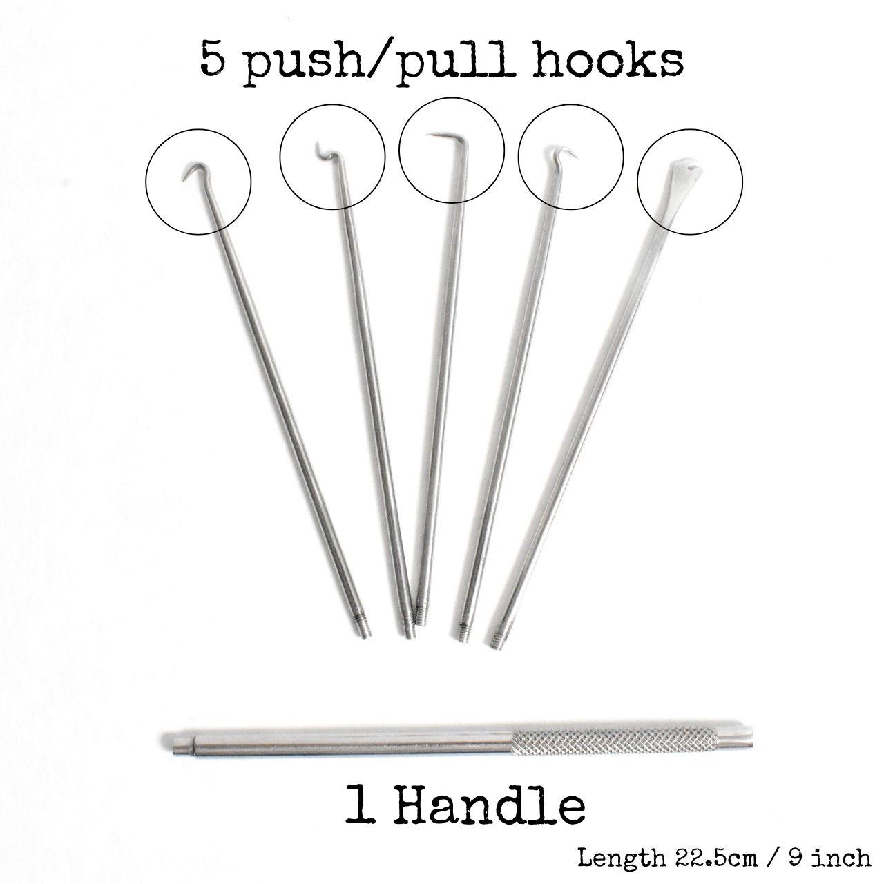 Dit is een set van 5 stuks duw- en trekhaken voor het werken aan typemachines, elektronica en ander precisiewerk. 2 duw- en 3 trekhaken.