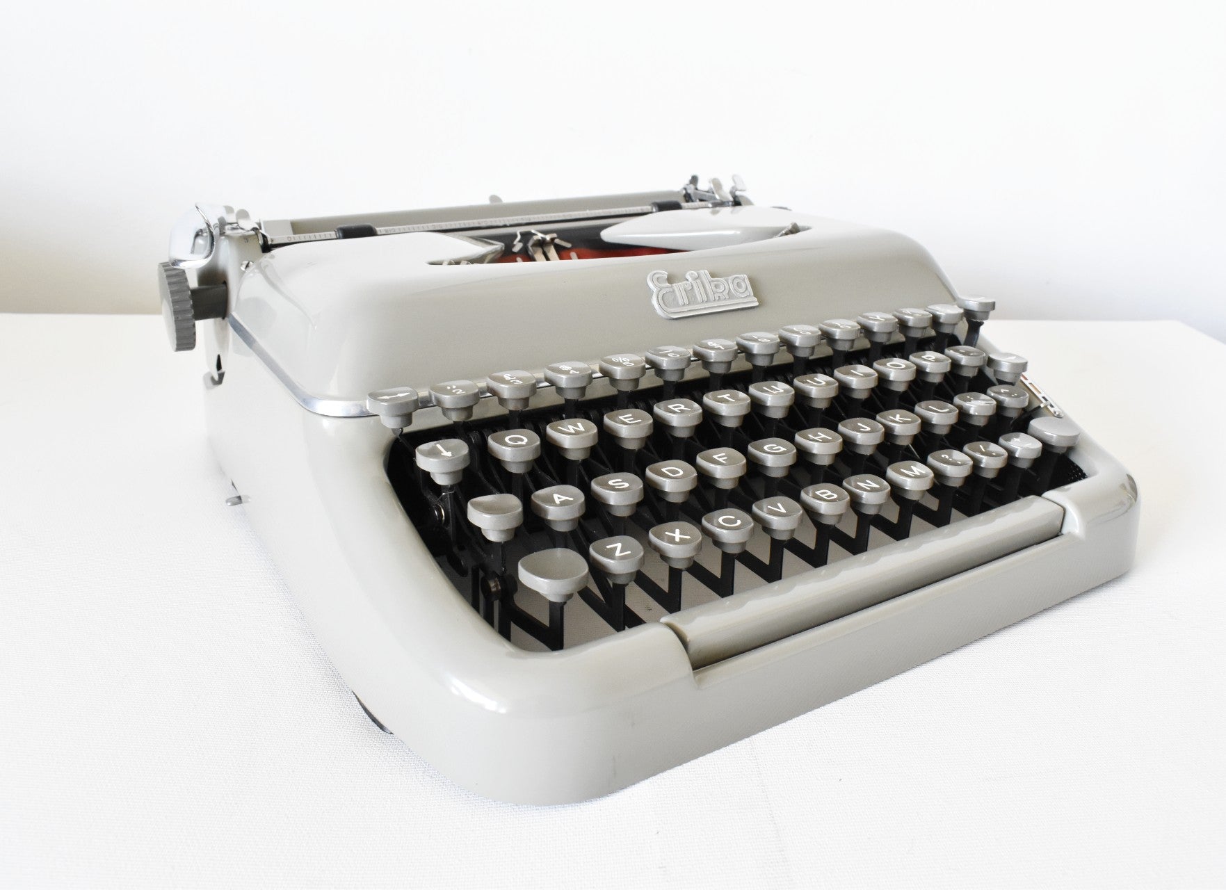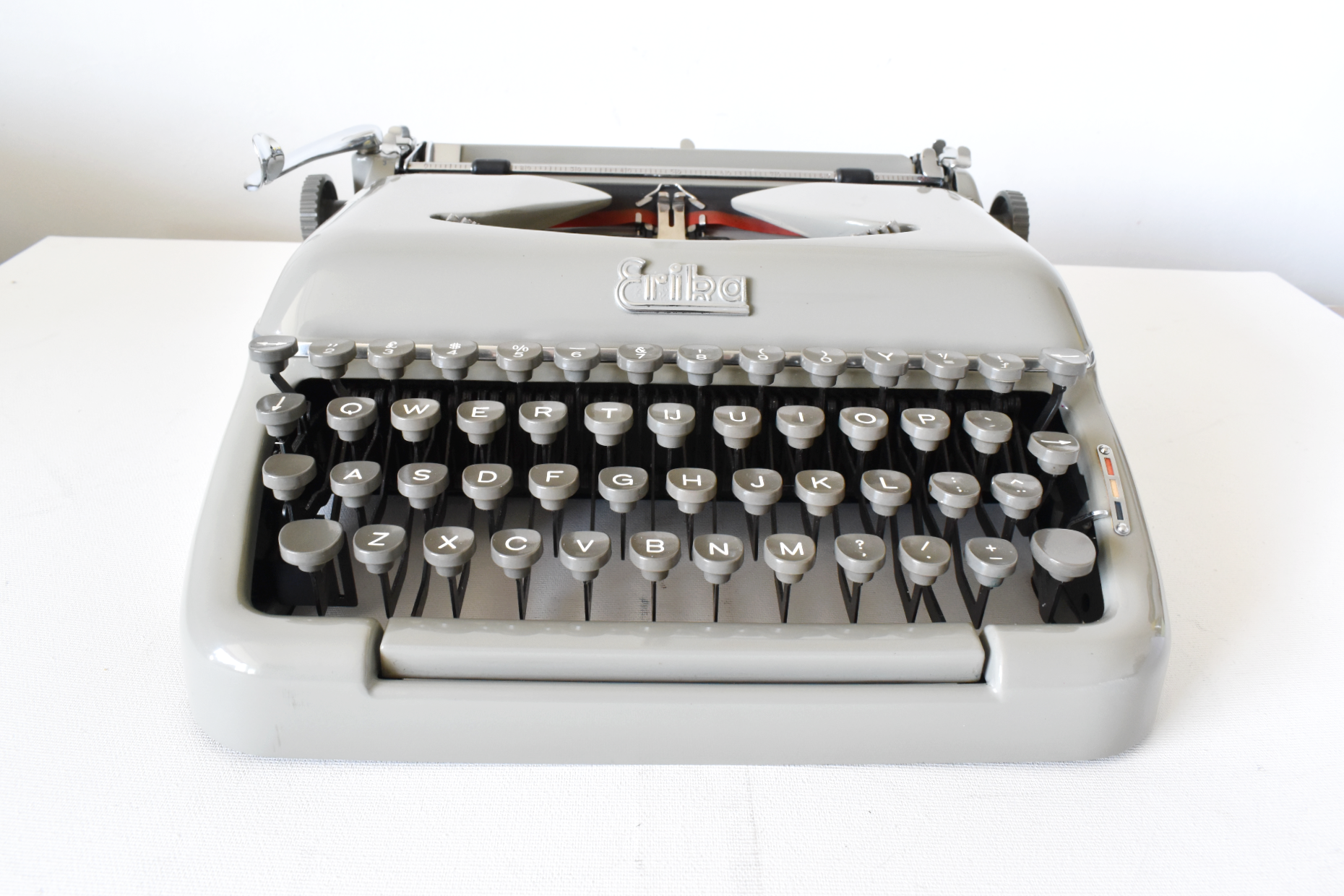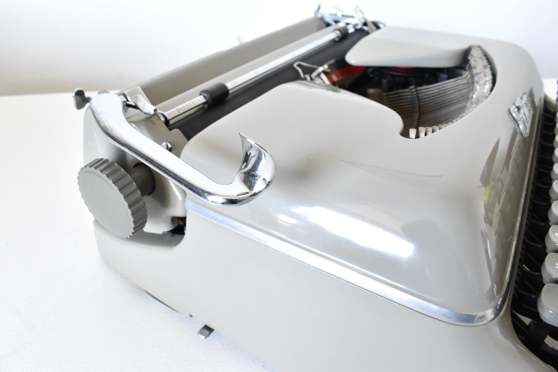 *COSMETICA: Deze typemachine verkeert in goede staat. Er zitten 3 kleine krasjes in de lak op verschillende plekken (het toetsenbord linksvoor en beide zijkanten waar de slede over de rails schuift). Deze kleine onvolkomenheden zijn te wijten aan normaal gebruik van de machine. Verder is de lak in uitstekende staat met een gladde, glanzende afwerking. De verchroomde metalen onderdelen zien er fantastisch uit. De machine is afgewerkt met een beschermende wax van museumkwaliteit om de lak te beschermen tegen oxidatie, vuil, krassen en vingerafdrukken.