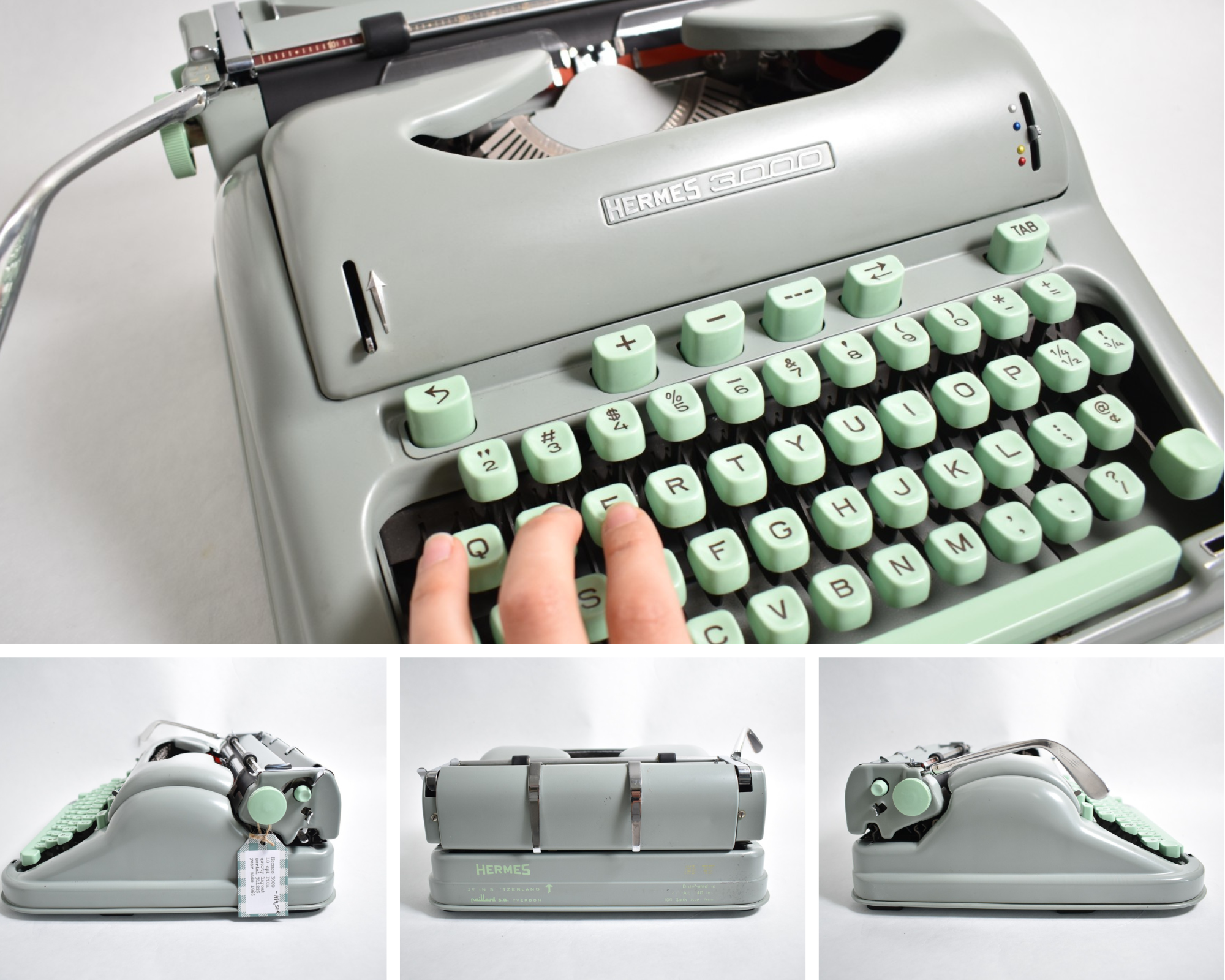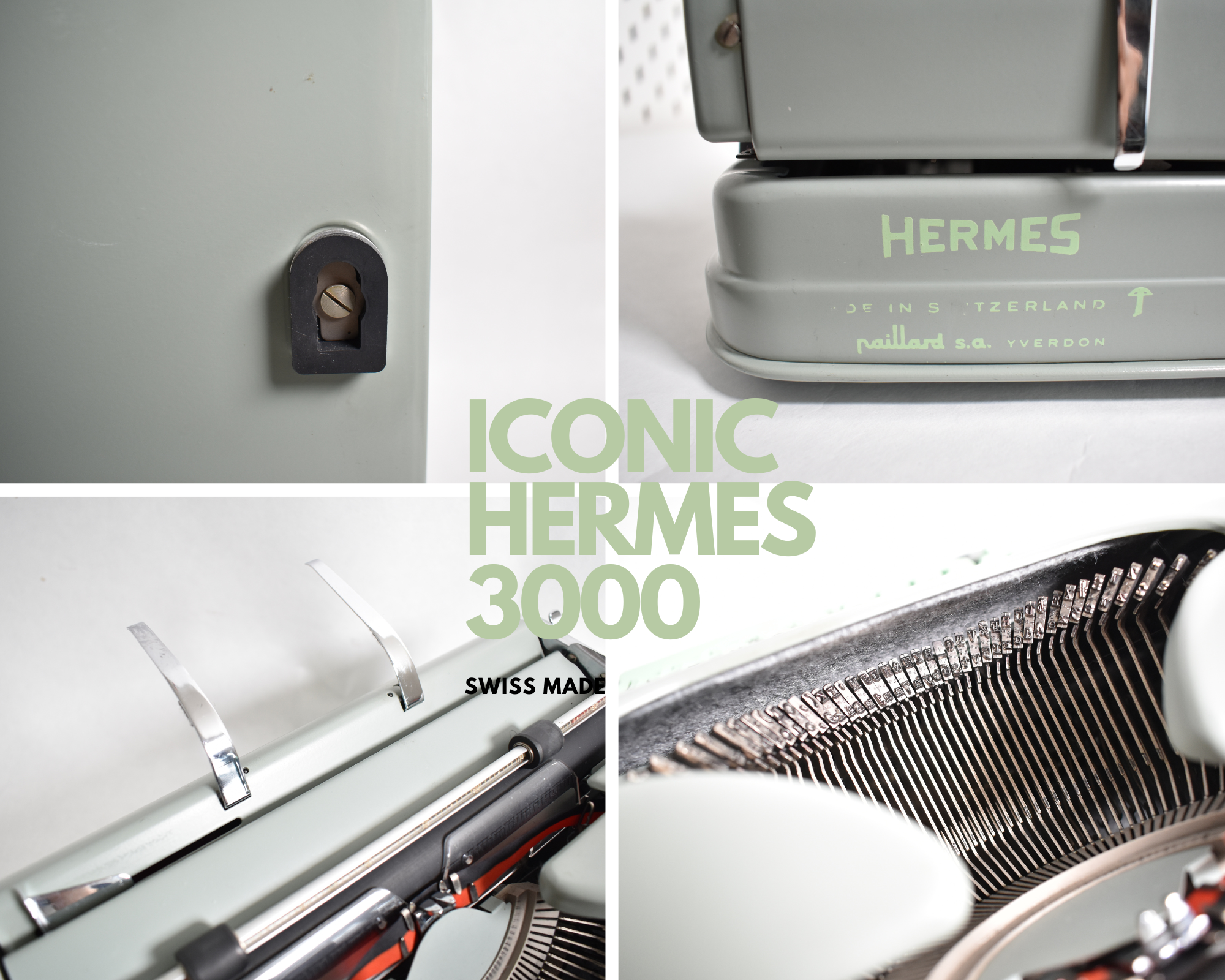 We presenteren u de iconische Hermes 3000 typemachine met mintgroene toetsen en behuizing. Hermes typemachines werden ontwikkeld in Zwitserland door het bedrijf Paillard, dat begin 19e eeuw begon met het maken van muziekdoosjes en begin jaren 20 overstapte op typemachines. De Hermes 3000 is misschien wel de beroemdste en coolste typemachine ooit. Hij beschikt over: