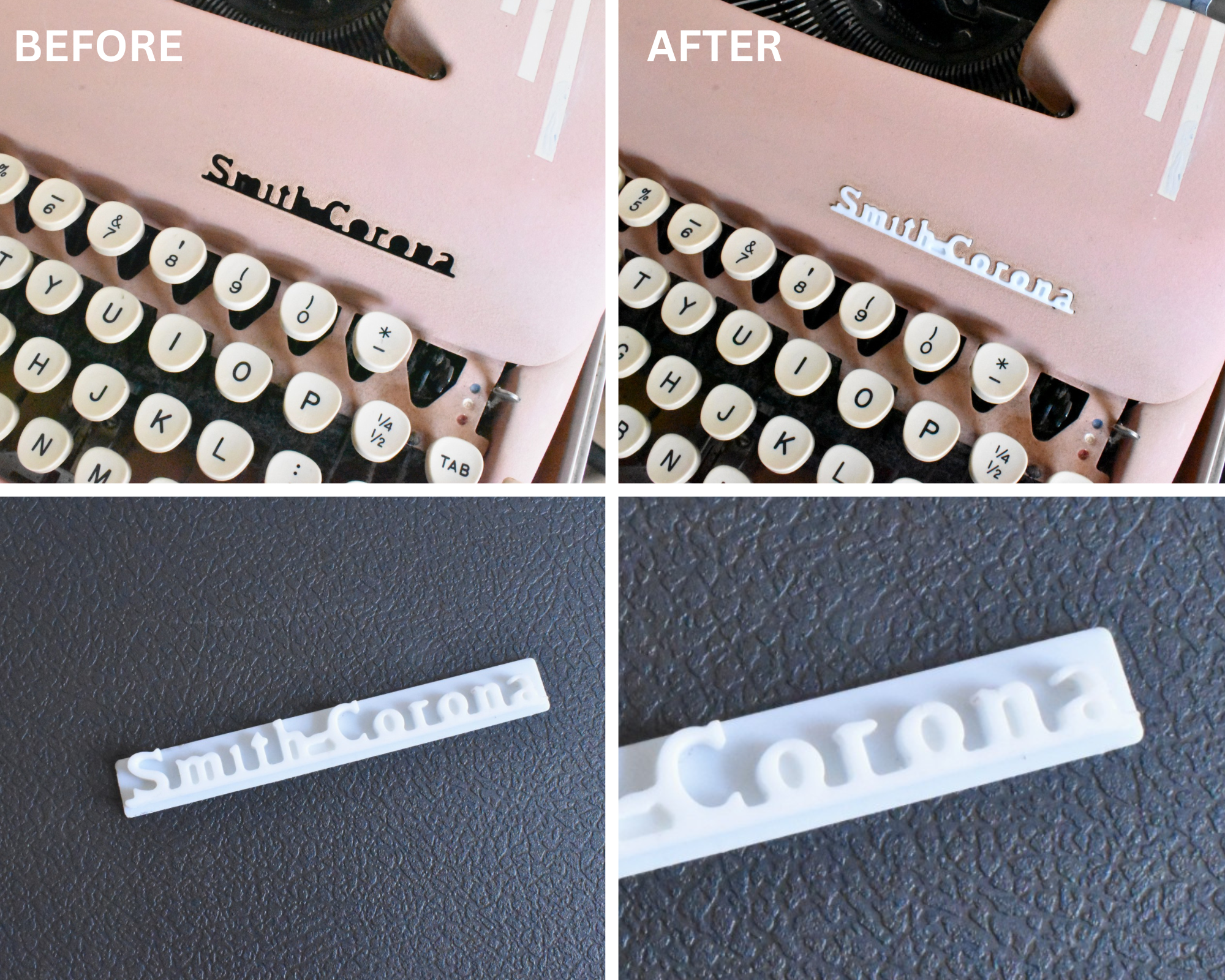Dit onderdeel is een gloednieuw naamplaatje voor Smith Corona. Het is 3D-geprint. Het is ontworpen om nauwsluitend te zijn en het originele naamplaatje op Smith Corona-typemachines te vervangen.