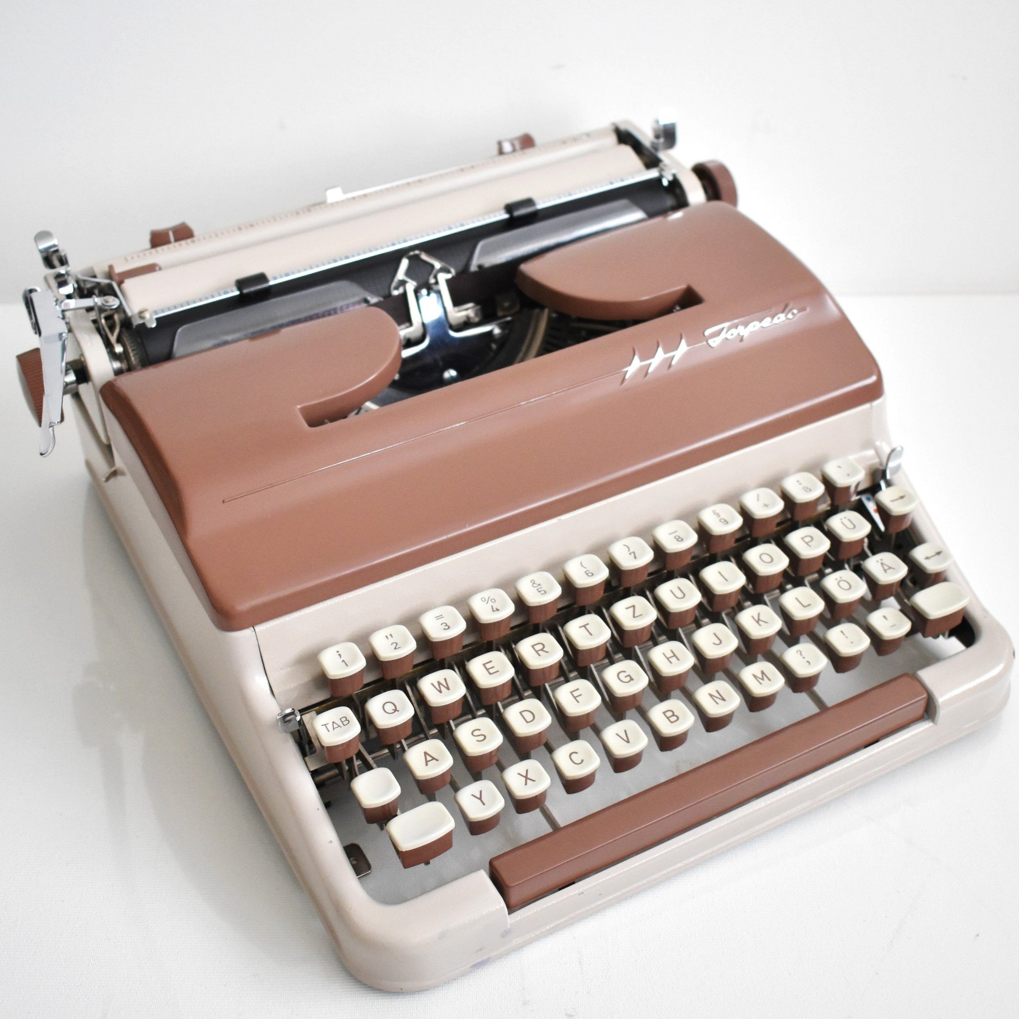 Een volledig functionele en prachtige Duitse Torpedo 18s typemachine uit 1960, in een zeer mooie, zeldzame chocolade/crème duotone kleur.
