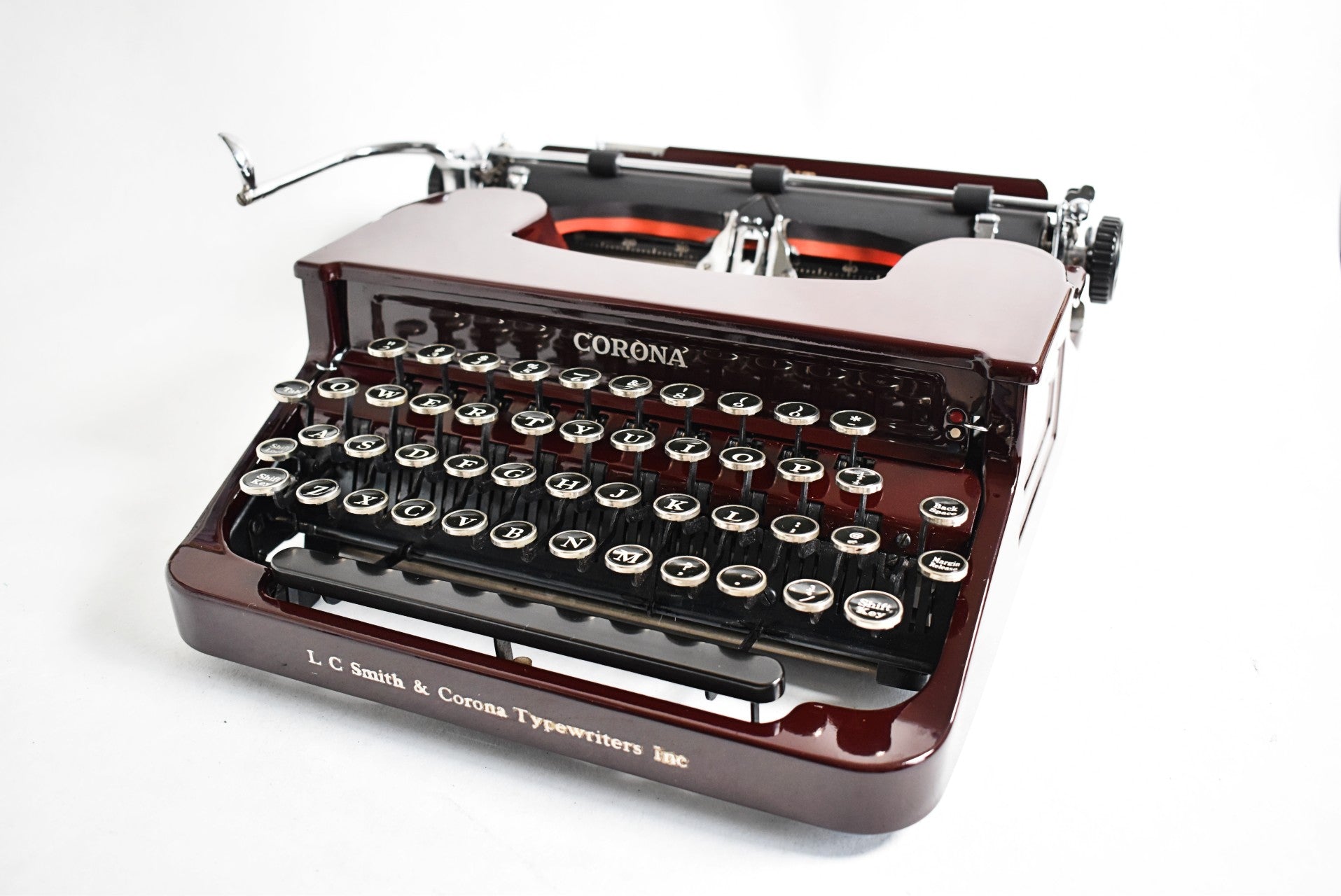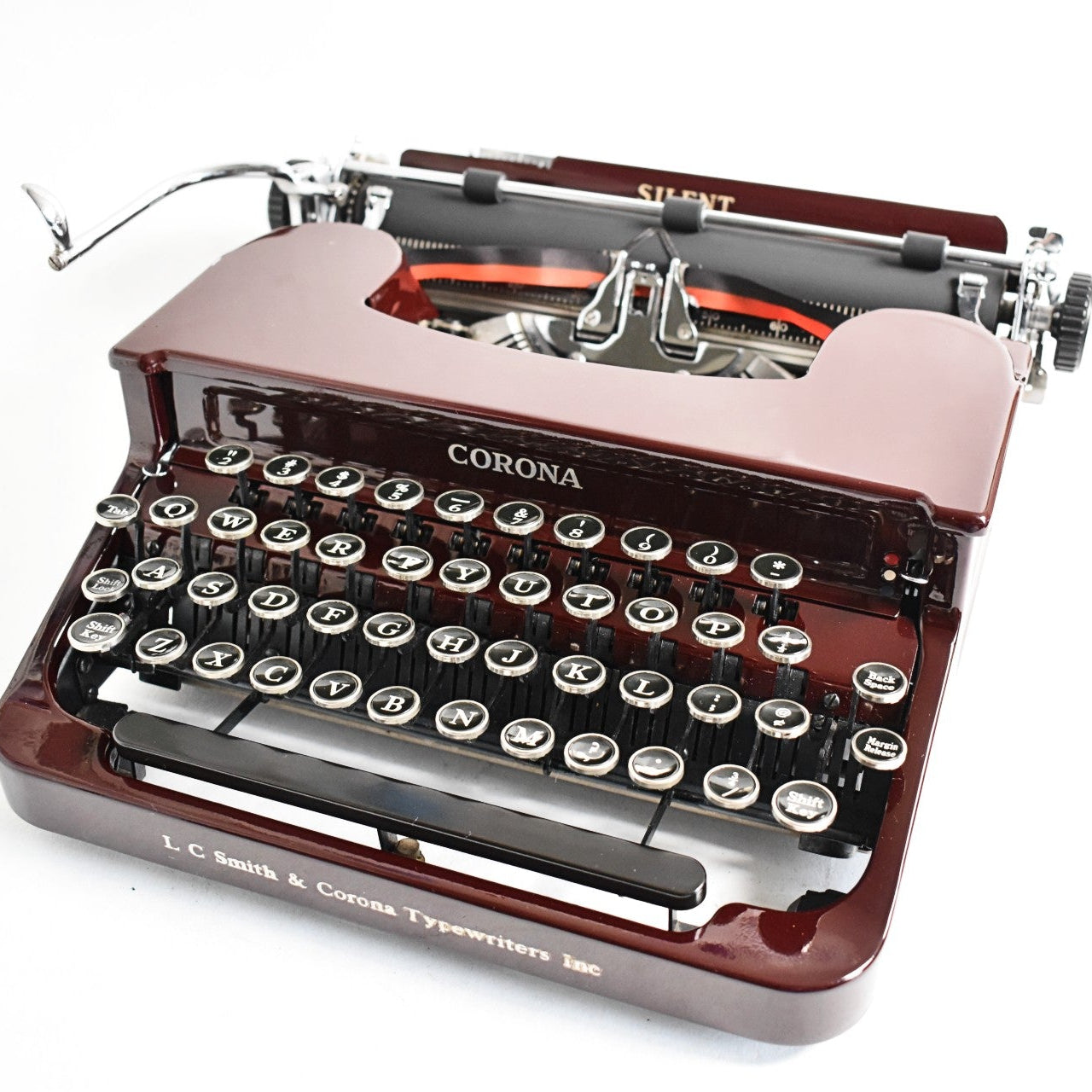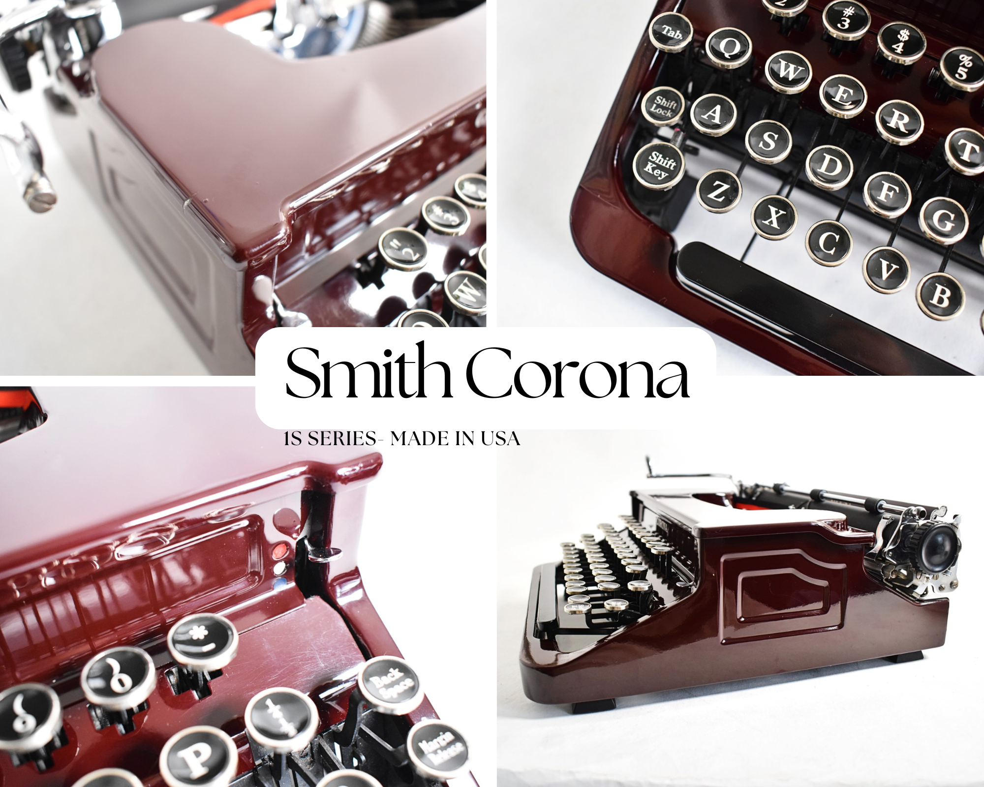Smith Corona is one of the most sought after typewriter brands, produced many popular portable models for writers throughout the years. This early 1936 Standard Smith Corona is a model of the 1S series. It has a great maroon finish (less common than it's black counterpart). It is a great typewriter choice for writers because it is heavy-duty and can keep up with regular use! This Corona typewriter boasts with a supple and light key feeling, fast responsive keys, and a light segment shift.
