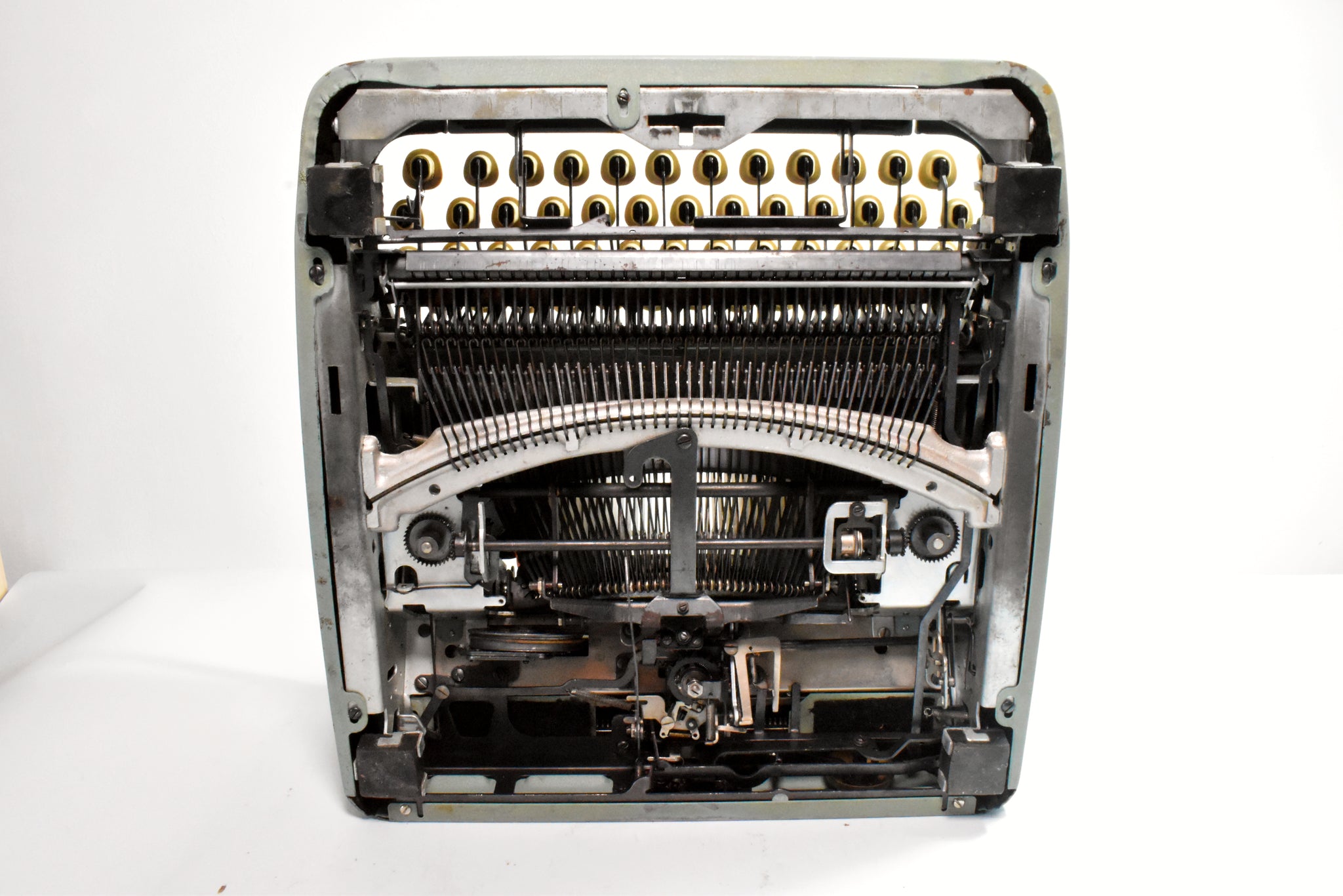 *COSMETICS: This typewriter is in good condition - age signs on the body and paint (mostly missing paint on the back plate - see photos). Beautiful smooth light green/blue crinkle finish (called teal).  The chrome plated metal parts look good, very few rust sides on the internals which have been addressed and treated. Overall, very good condition after cleaning/polishing/servicing.