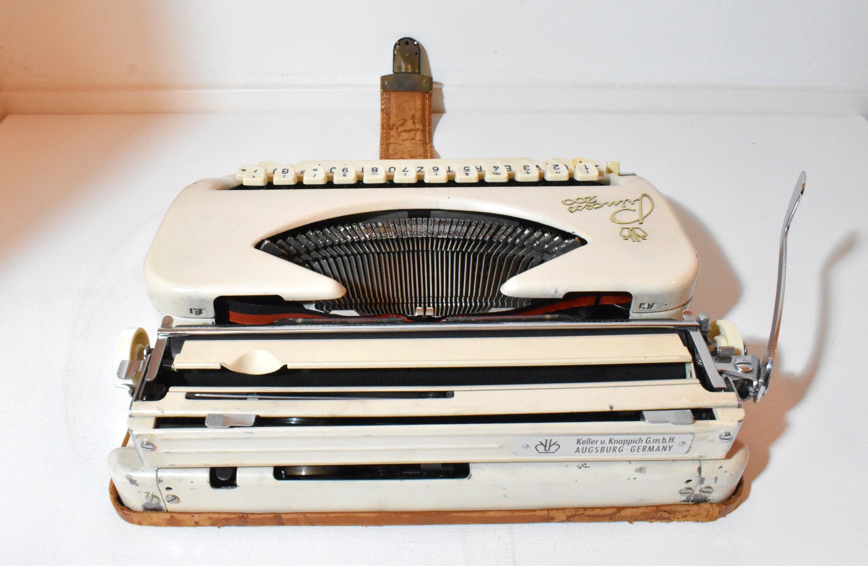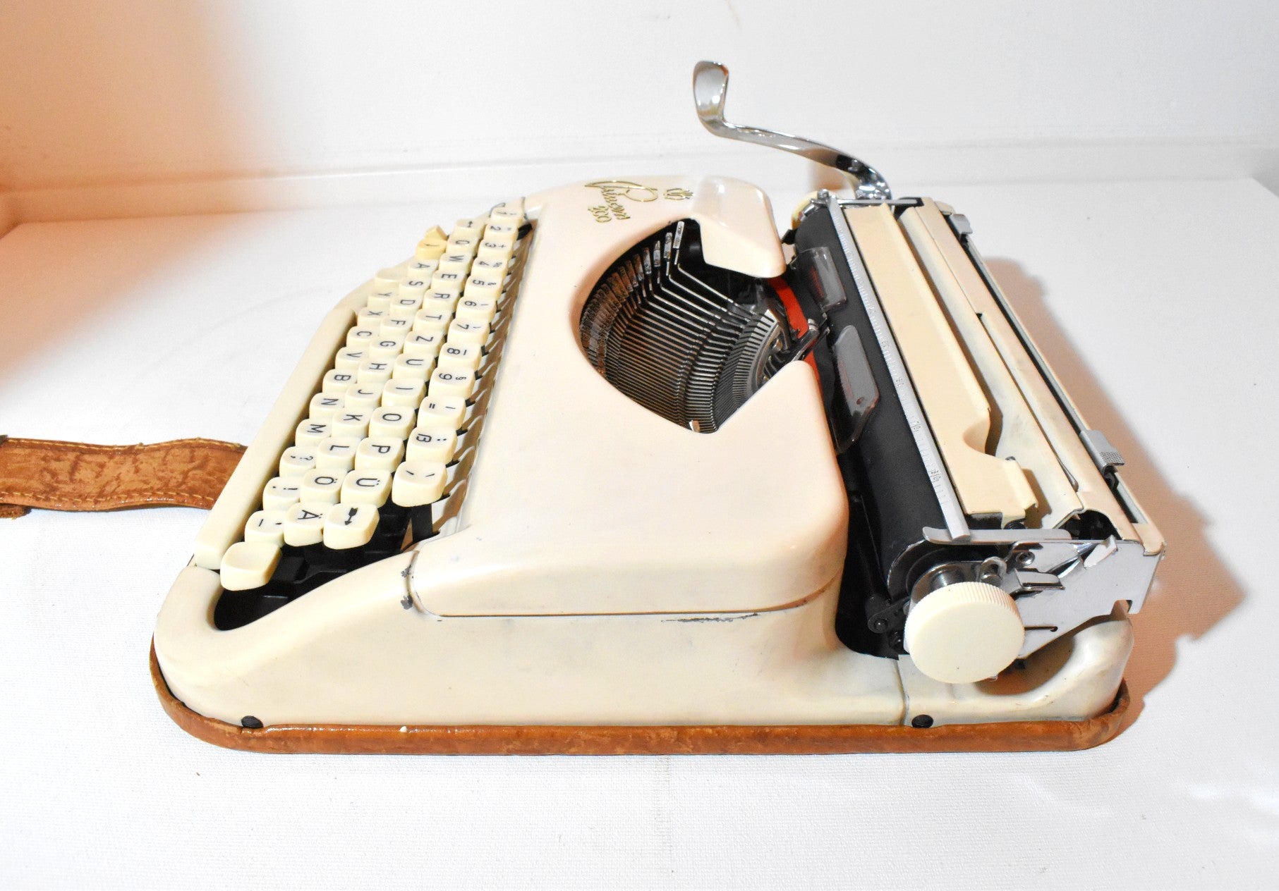 Princess 300 is one of the most popular typewriter lines. Famous for their elegant design, responsive keyboard and a fun color selector button, this one was produced in 1958. It comes with a DE LUXE case - not common for Princess 300. It comes in a stunning cream color, the logo is golden and the case...it's a fantastic textured leather case with a comfortable handle.