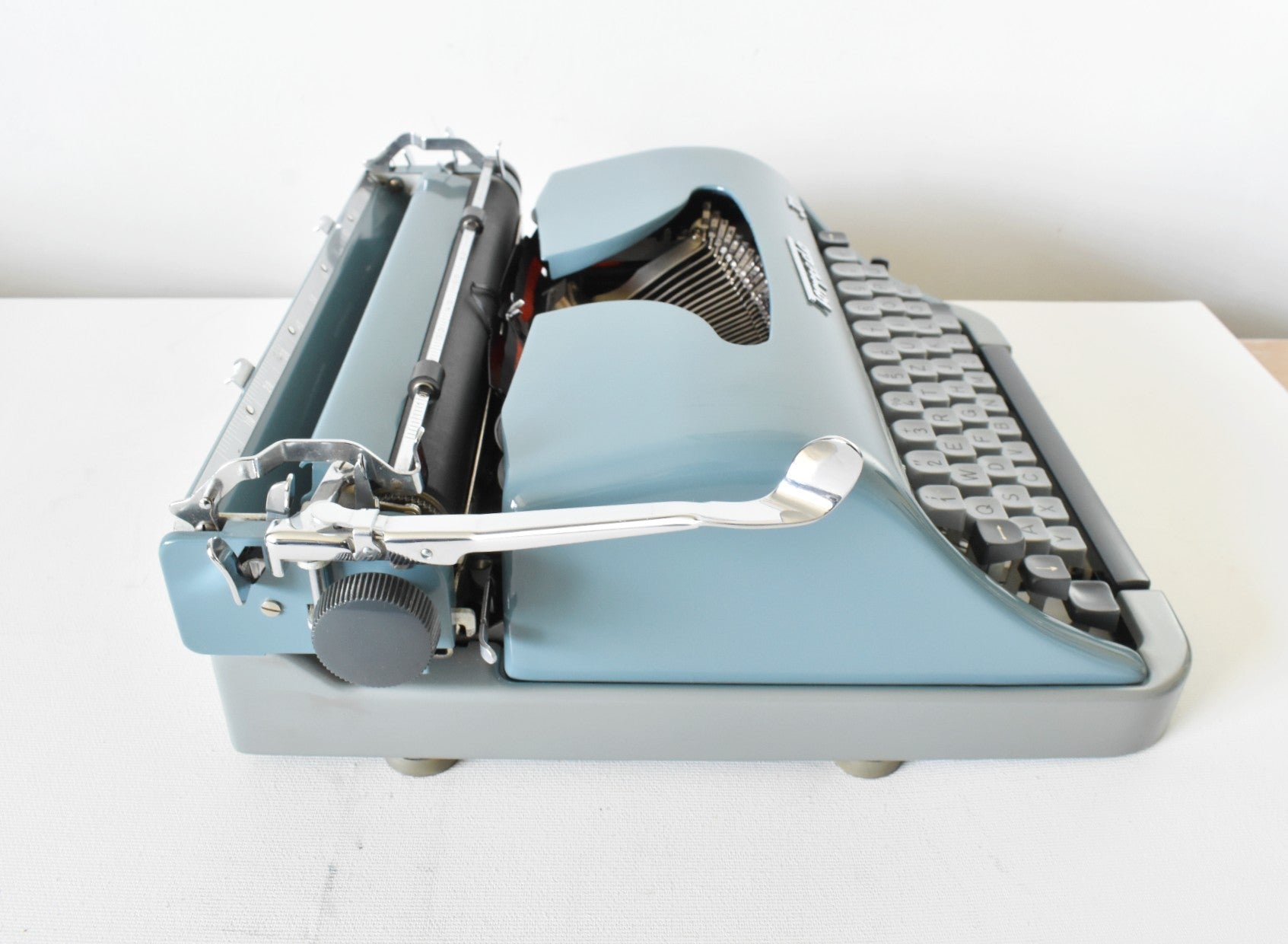 *COSMETICS: This typewriter is in excellent condition. Minimum age signs. The blue/gray glossy paint is in great shape with a smooth, semi shiny finish. The chrome plated metal parts look great. The machine is finished off with a protective, museum-quality wax in order to protect the paint from oxidation, dirt, scratches and fingerprints.