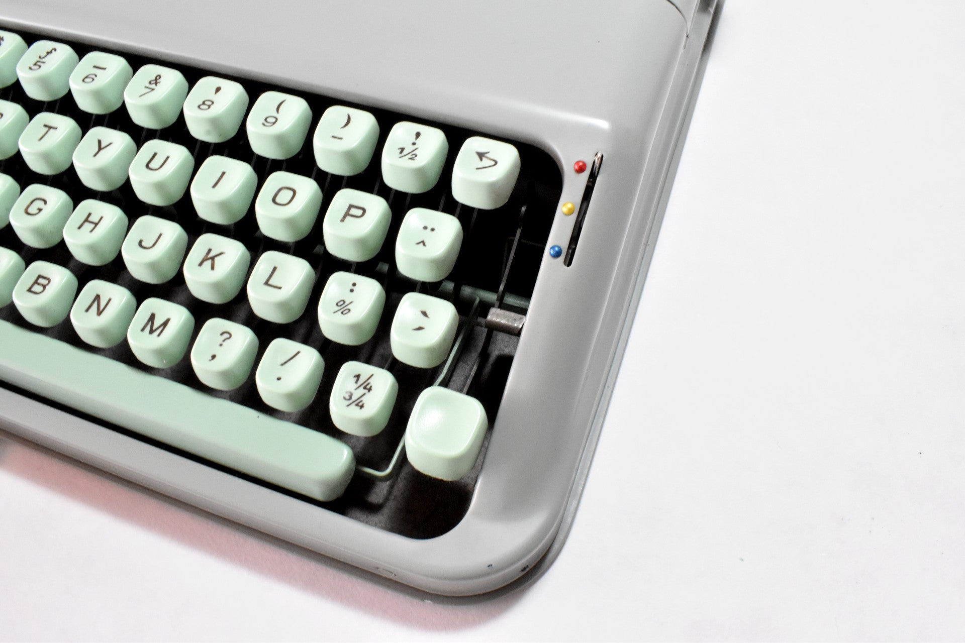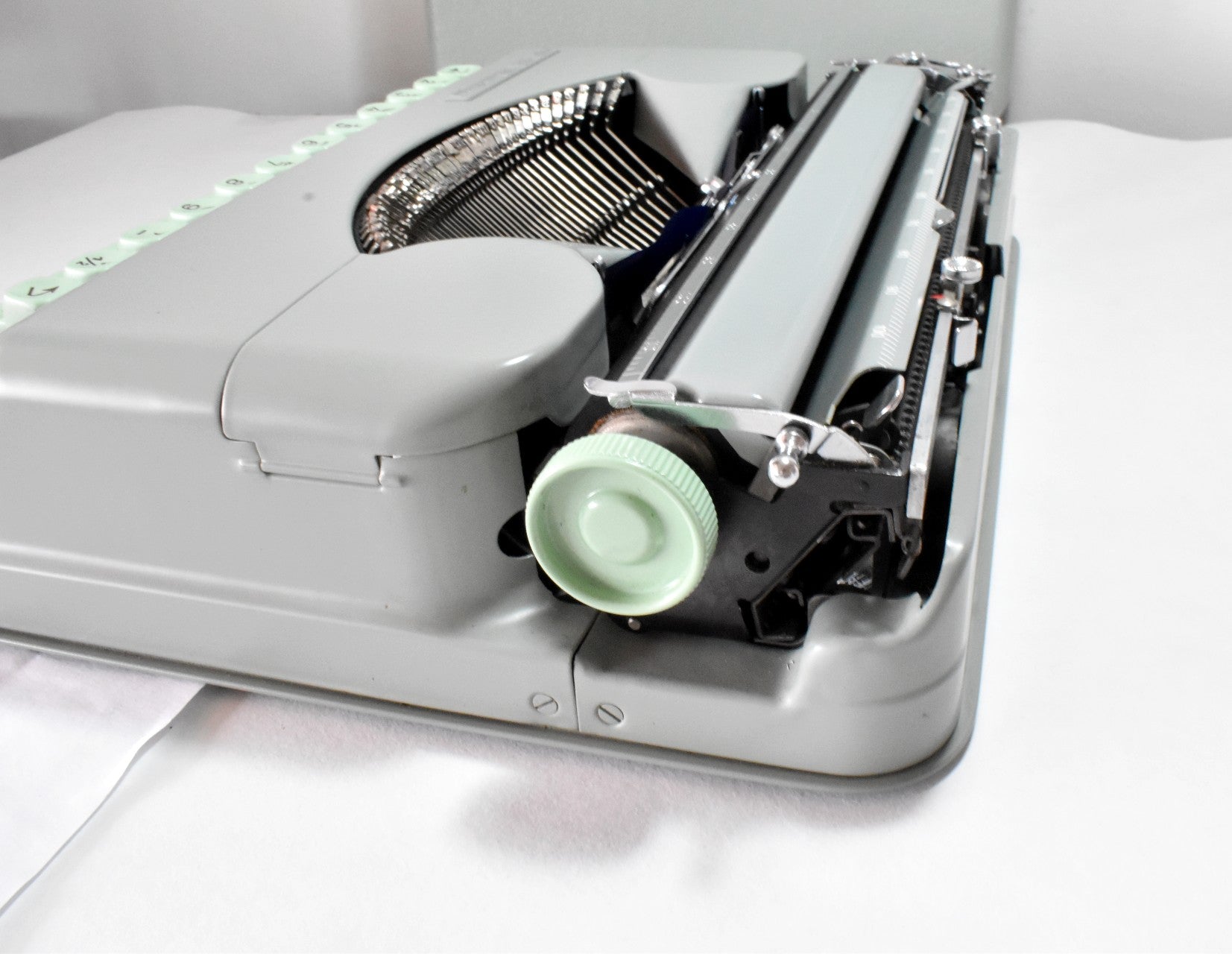*MECHANICS: As with all our serviced typewriters - this one is in outstanding mechanical condition. As part of our restoring this typewriter has been thoroughly cleaned and has received new blue ink and new rubber feet for optimal grip. We disassemble the typewriter and perform stress testing and also replace old/worn out parts. The typewriter is now ready to withstand many hours of heavy typing with it's smooth carriage, light keys and sturdy design. It has new rubber feet, new felt pads, fine tuned and aligned to serve a minimum of 50 more years.