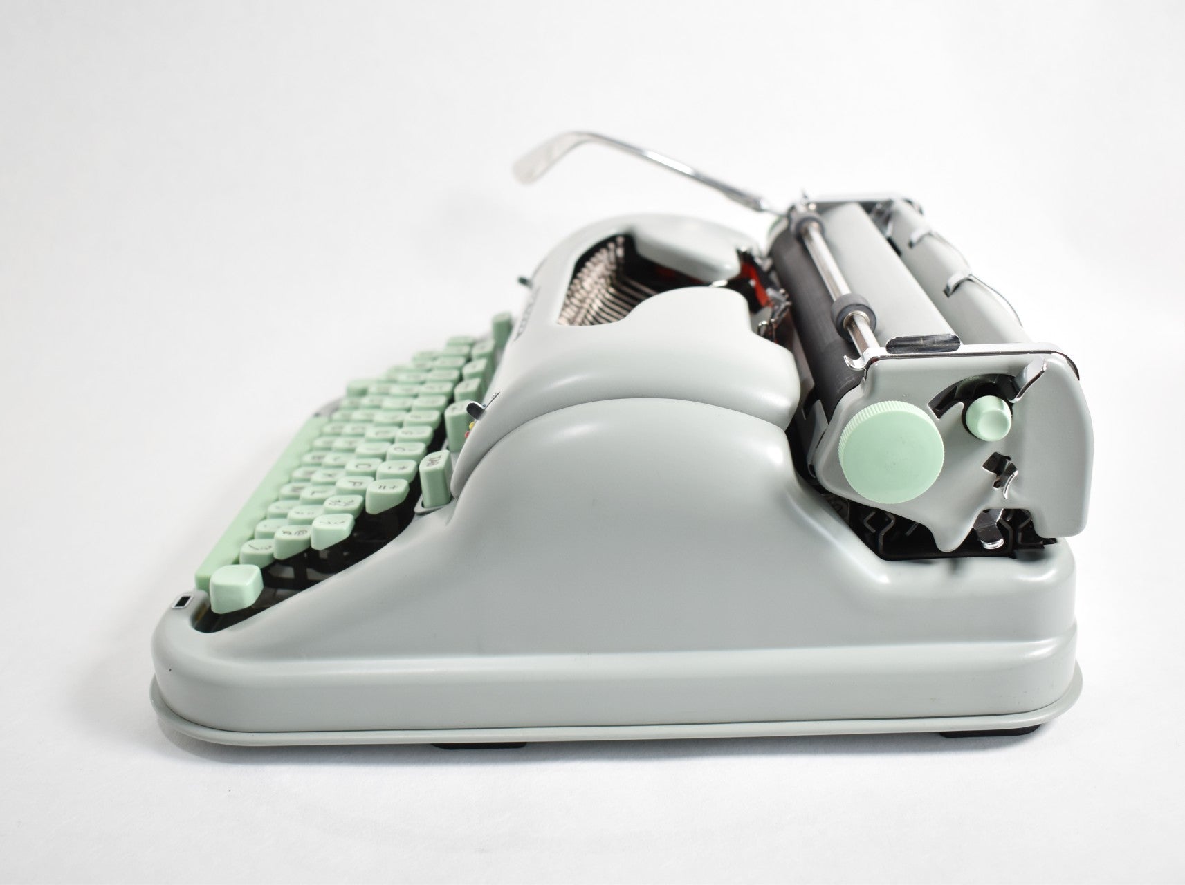 A true icon - the Hermes 3000 typewriter with mint green keys and body. Hermes typewriters were developed in Switzerland by the Paillard S.A. company, which started out making music boxes in the early 19th century and later transitioned to typewriters in early 1920s. Hermes 3000 is possibly the most famous and cool typewriter ever.