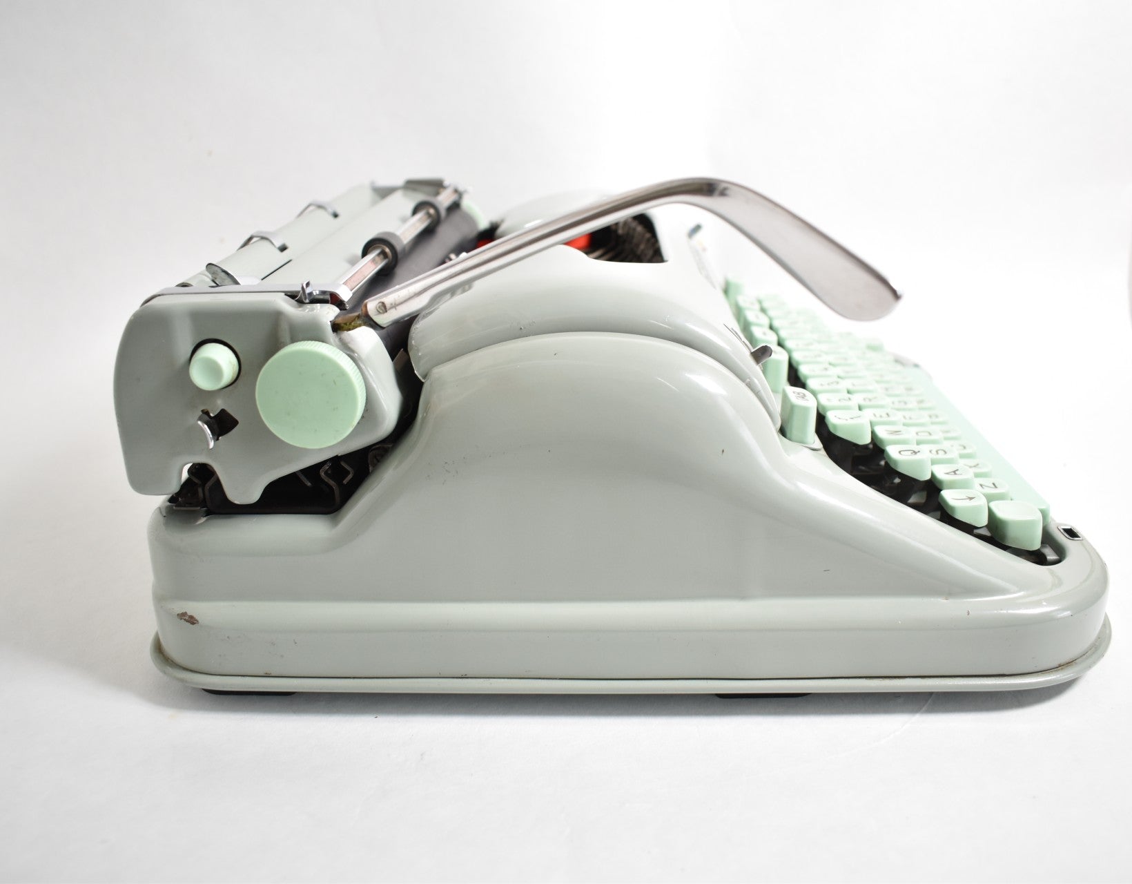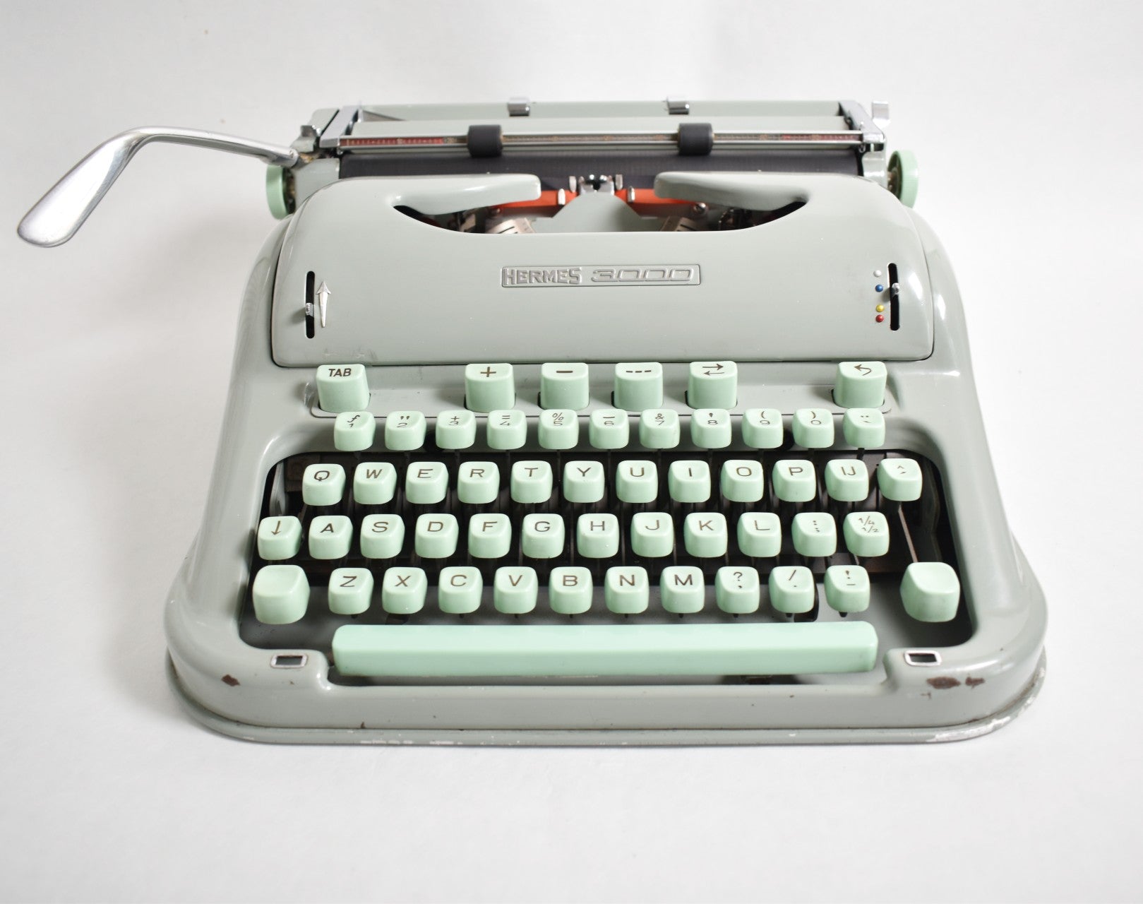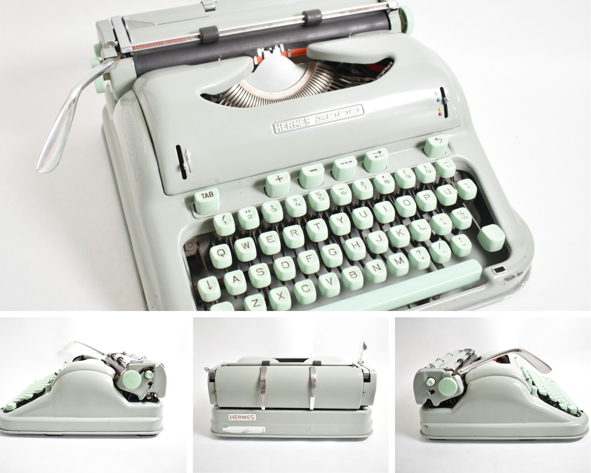 Presenting to you the iconic Hermes 3000 typewriter with mint green keys and body. Hermes typewriters were developed in Switzerland by the Paillard company, which started out making music boxes in the early 19th century and later transitioned to typewriters in early 1920s. Hermes 3000 is possibly the most famous and cool typewriter ever. It features:
