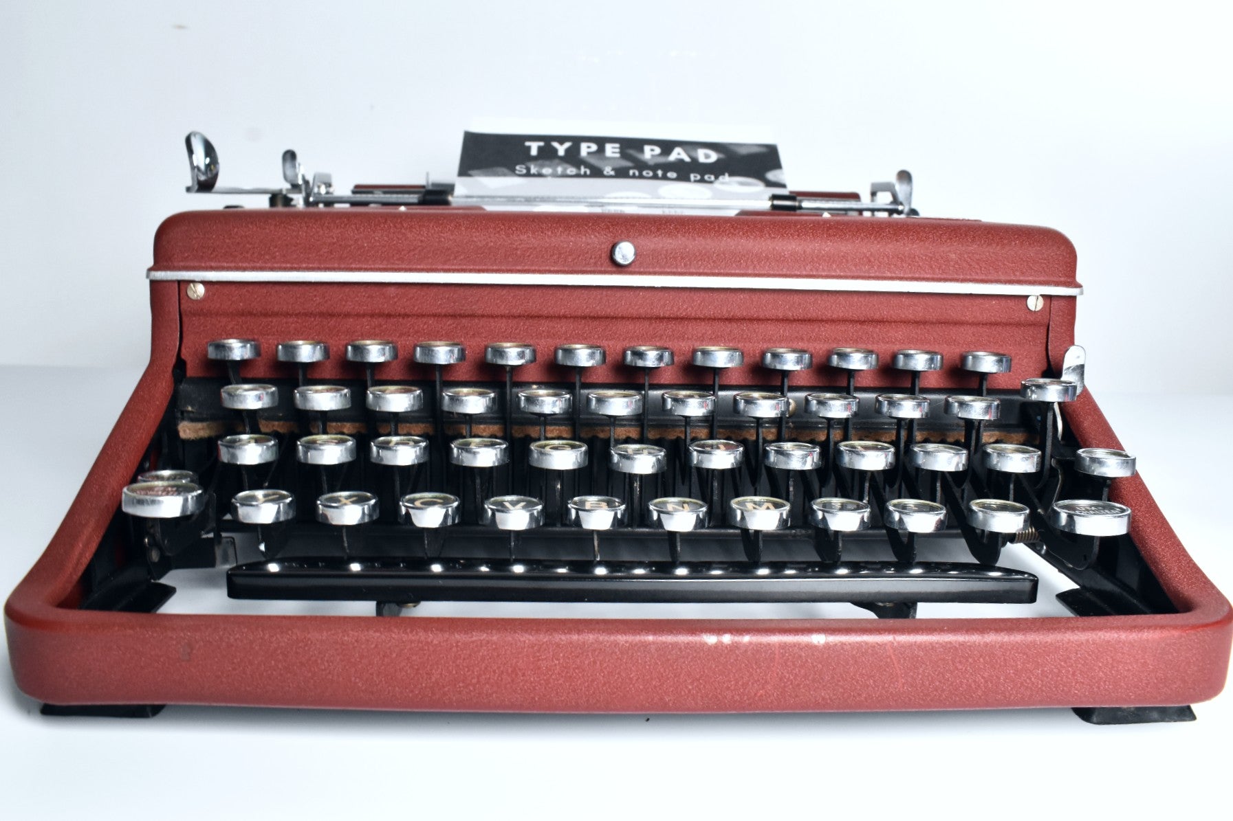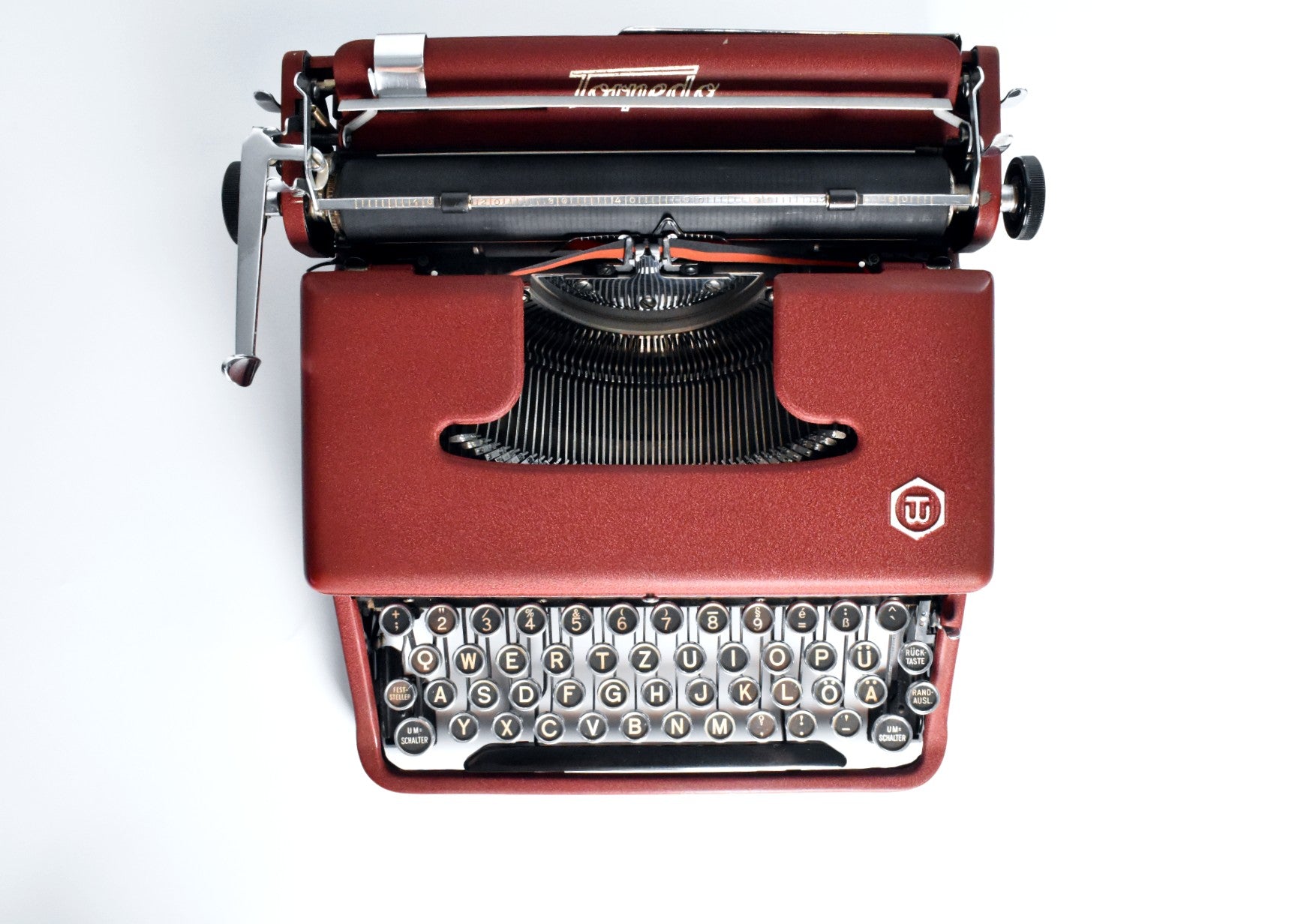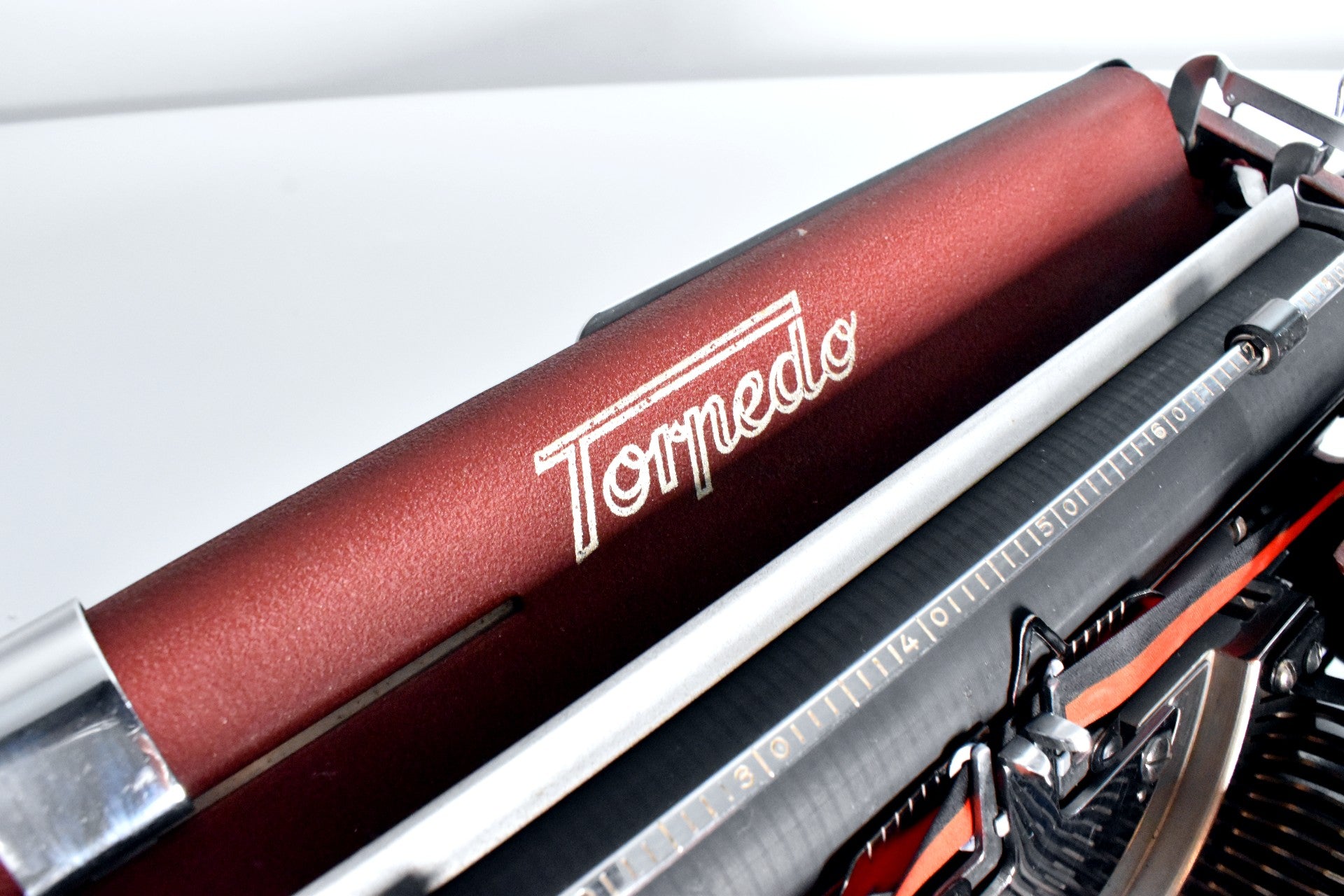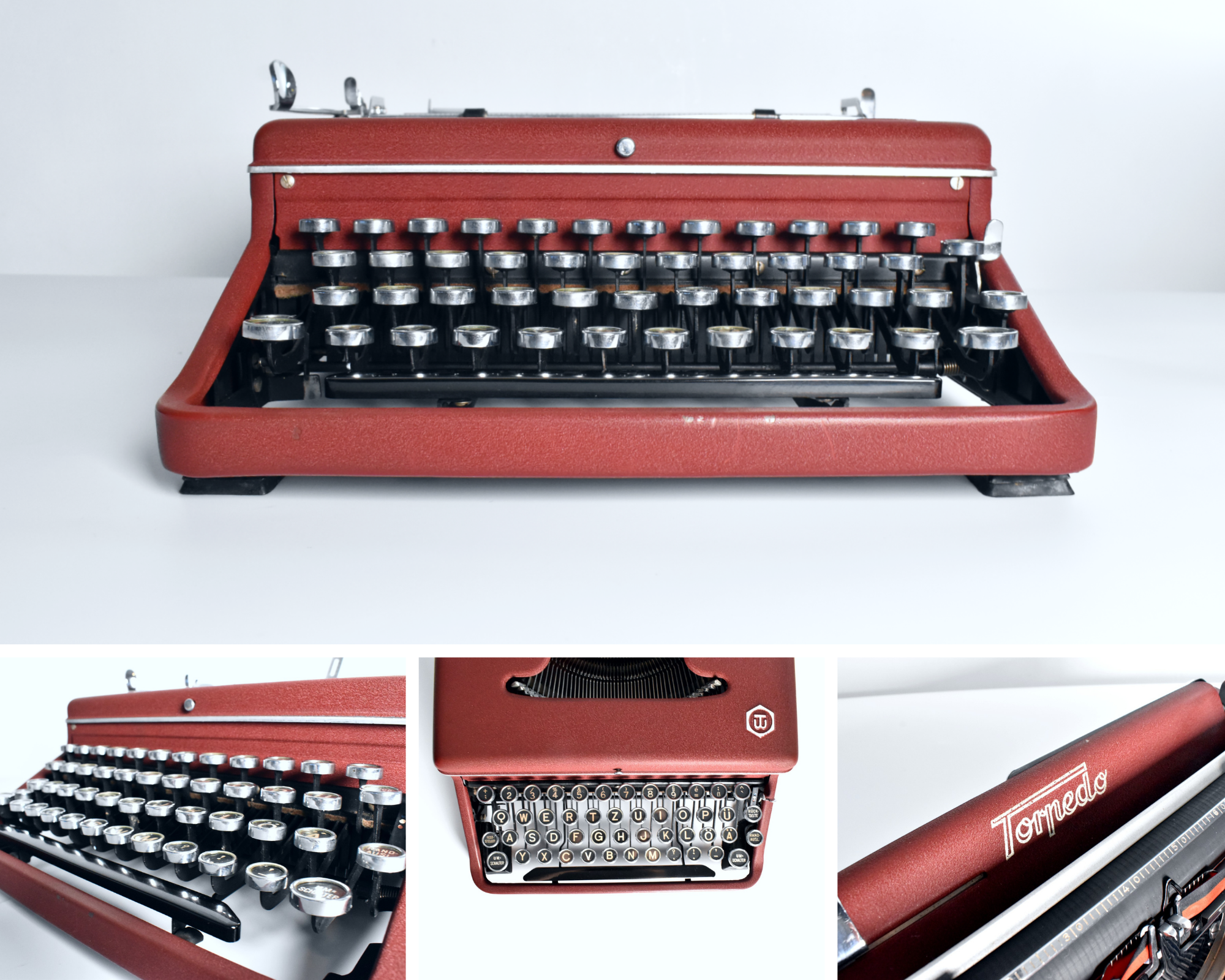 A fully professionally serviced and beautiful German Torpedo 18a typewriter from 1950, in very beautiful, uncommon ruby red color. It is a stunning piece, museum quality in great condition!