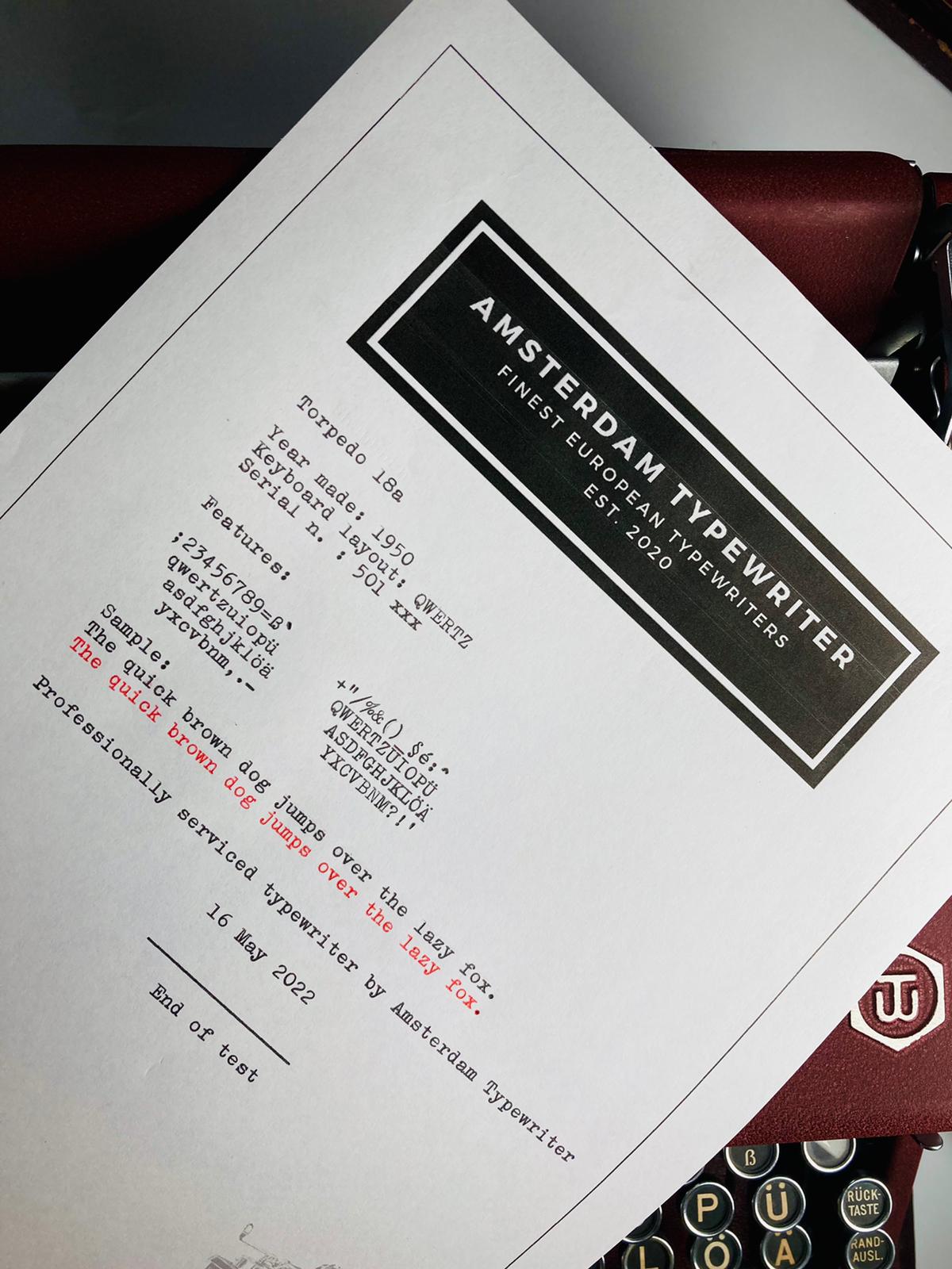 *COSMETICS: This typewriter is in excellent condition. It had very few to no scratches or missing paint. It really is one of the best Torpedo's we have had serviced in our workshop! All the glass keys are clear, shiny and clean. The chrome plated metal parts have been cleaned. The machine is finished off with a protective, museum-quality wax in order to protect the paint from oxidation, dirt, scratches and fingerprints.